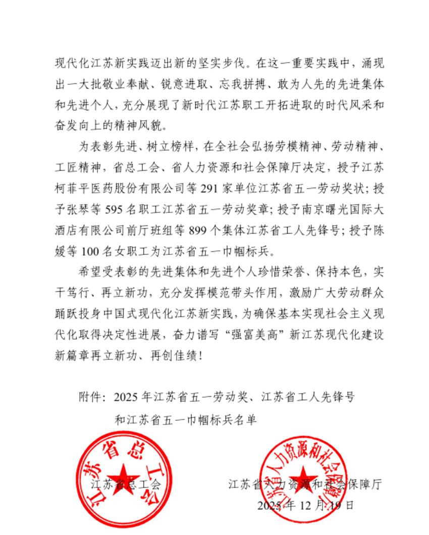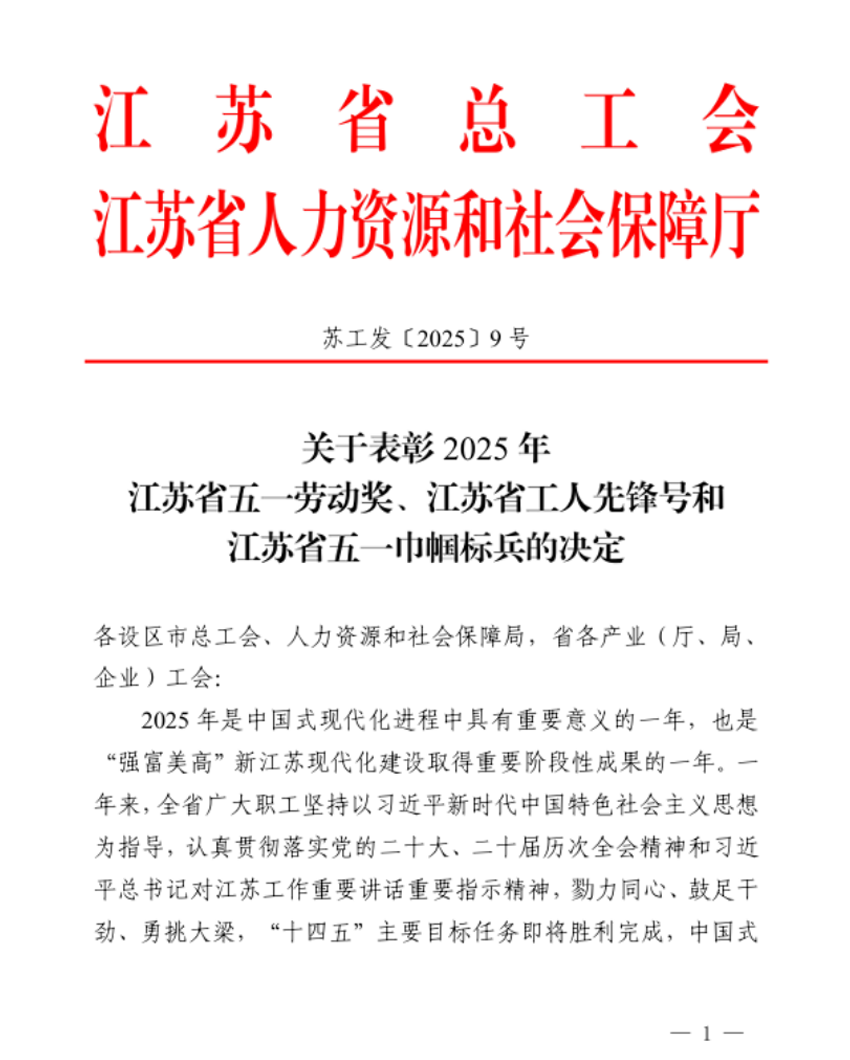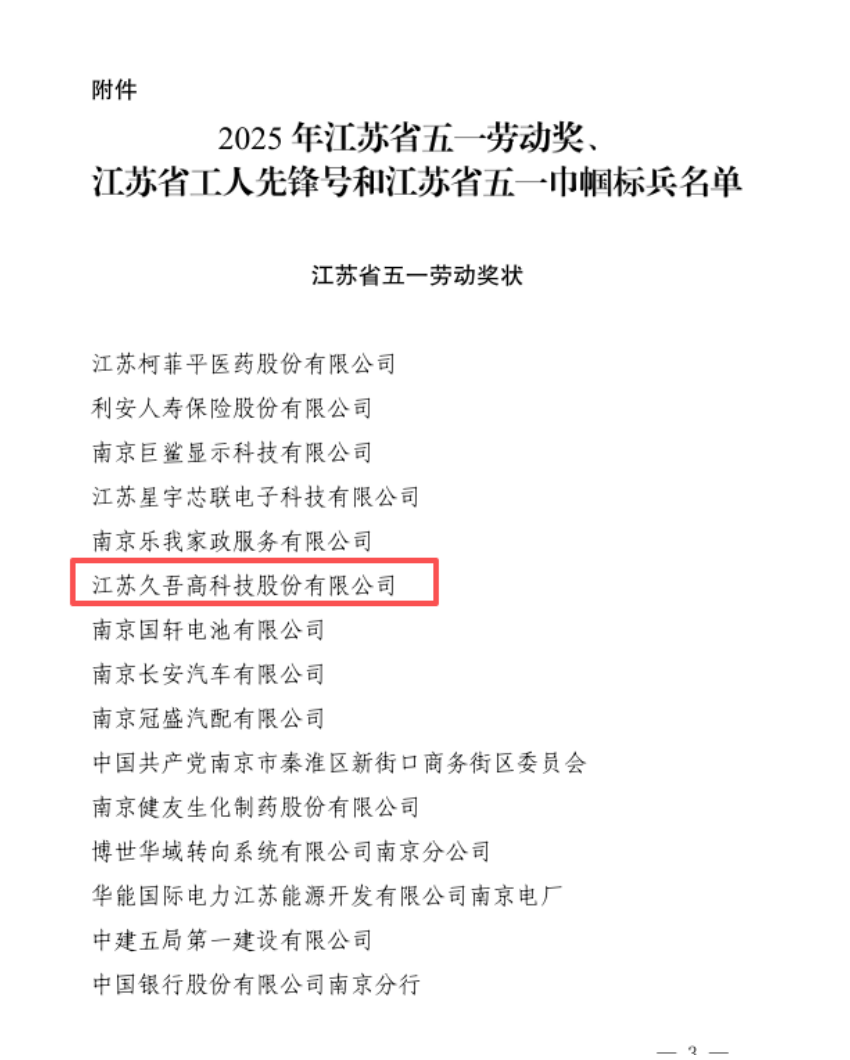 近日,江苏省总工会正式公布2025年江苏省五一劳动奖表彰名单,久吾高科凭借在科技创新、产业引领、人才培育和社会责任等方面的卓越表现,荣获"江苏省五一劳动奖状"。这一殊荣是对久吾高科全体员工辛勤付出的高度认可,更是对企业深耕实业、勇毅创新的充分肯定。