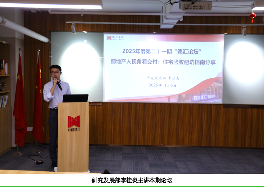 宣讲结束后,2025年第二十一期“德汇论坛”正式开始,本期主题为《前地产人视角看交付:住宅验收避坑指南分享》,由研究发展部李桂炎主讲。李桂炎拥有前地产行业工作经验,既熟悉装修供应商运作逻辑,也了解业主核心需求,为大家带来了兼具实用性与针对性的住宅装修全流程避坑技巧。